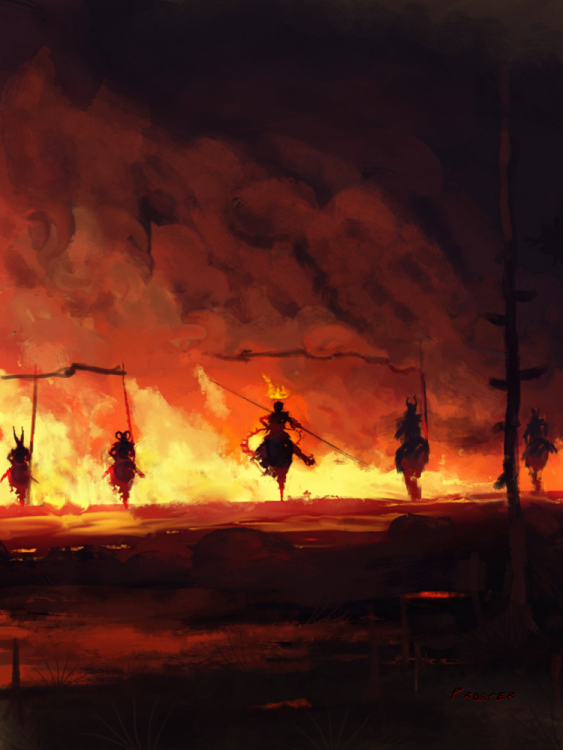 Depicts a group of riders from Avernus, the first circle of hell. When young Kim, the Fire Ball Squad witch, first discovered the powers of crossing the planes of existence, she caught the attention of dark minds from Avernus. The Fallen King sent his undead knights in search of the young witch. These creatures from the nightmare relentlessly followed the Fire Ball Squad. On several occasions, they almost managed to fulfill their goal. The Fire Ball Squad finally put an end to them in an epic battle on the bridge that connects the Hieldhen mountain range and the Holy Lotus Temple.